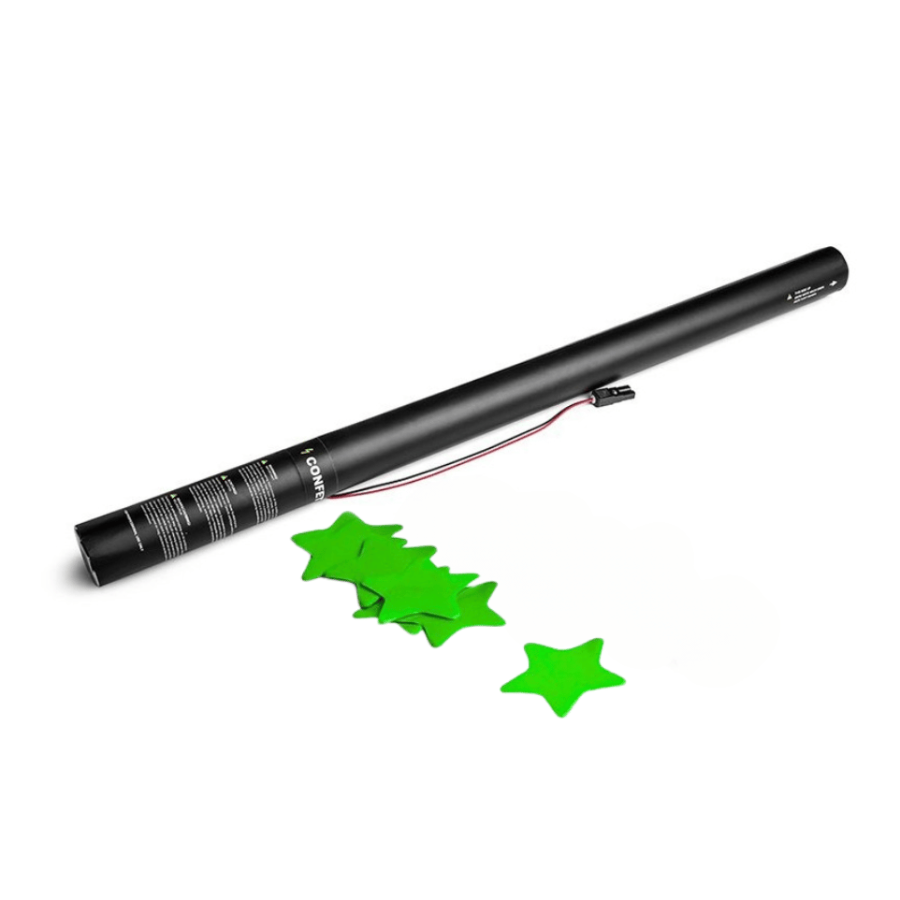 Los Cartuchos Eléctricos de 80 cm rellenos de Estrellas de Papel Verde Claro de Máquinas FX son ideales para crear un efecto visual fresco y vibrante en cualquier evento. Fabricados con estrellas de papel ignífugo y biodegradable, garantizan un uso profesional seguro y respetuoso con el medio ambiente.