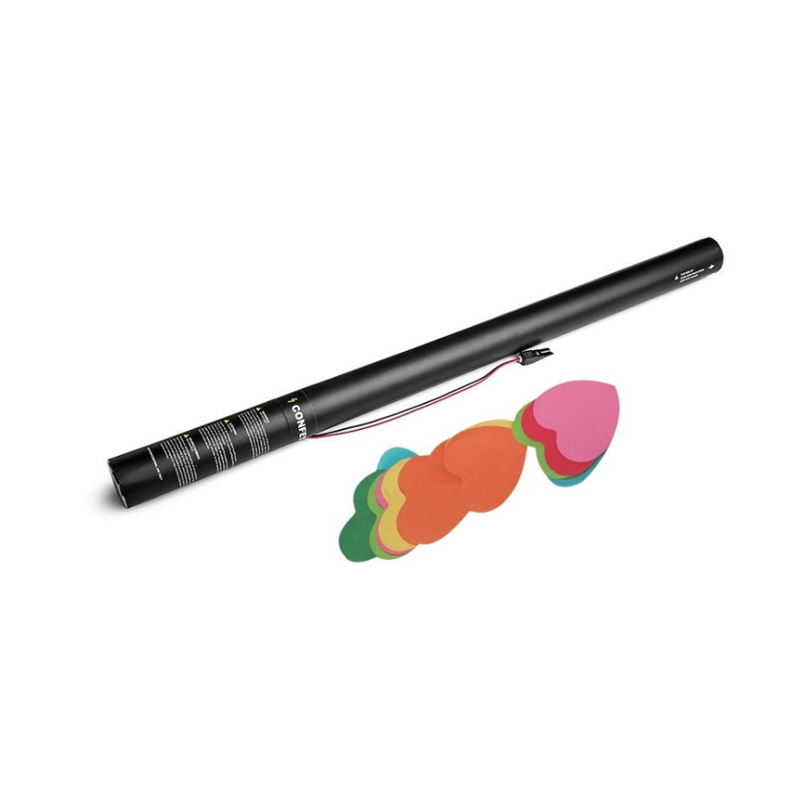 Los Cartuchos Eléctricos de 80 cm rellenos de Confeti de Papel en Forma de Corazones Multicolor de Máquinas FX son la opción ideal para aportar un efecto visual divertido y romántico en cualquier evento. Fabricados con confeti de papel ignífugo y biodegradable, garantizan un uso profesional seguro y respetuoso con el medio ambiente.
