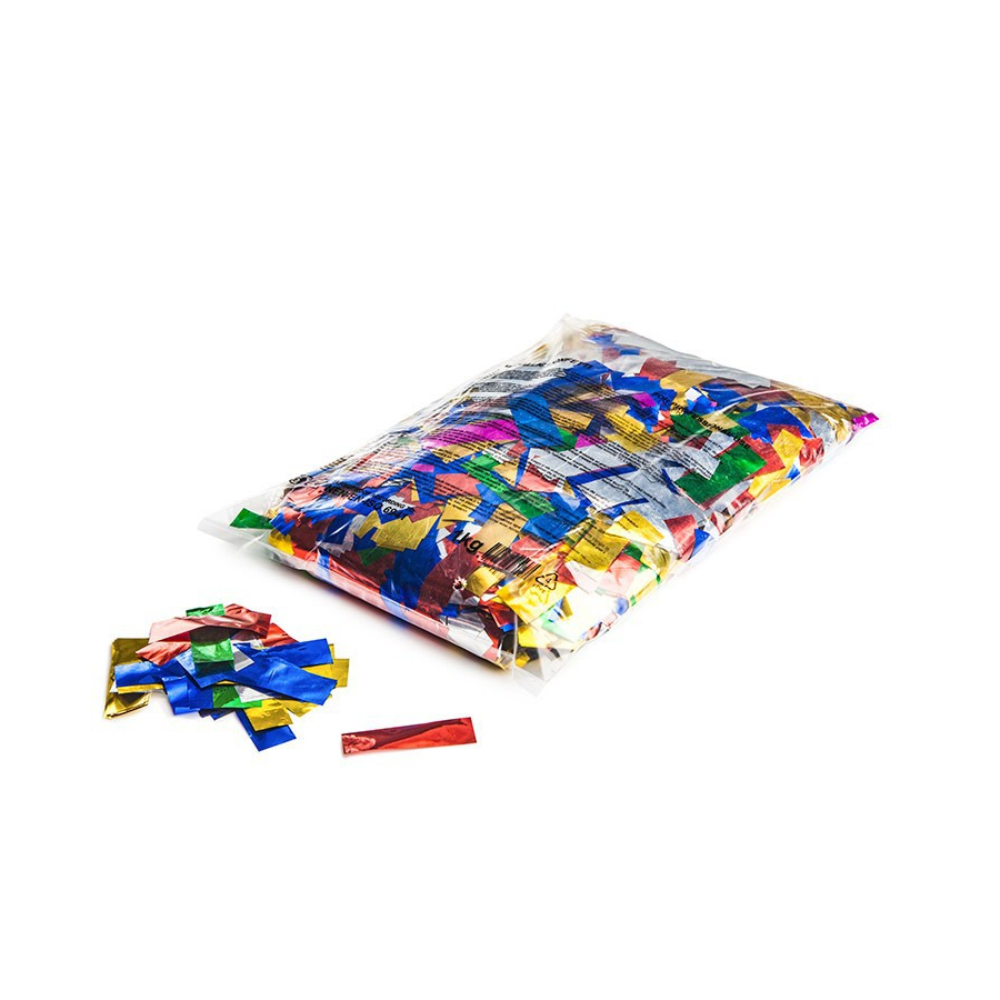 • · 1 kg de confeti metalizado rectangular en el color seleccionado.