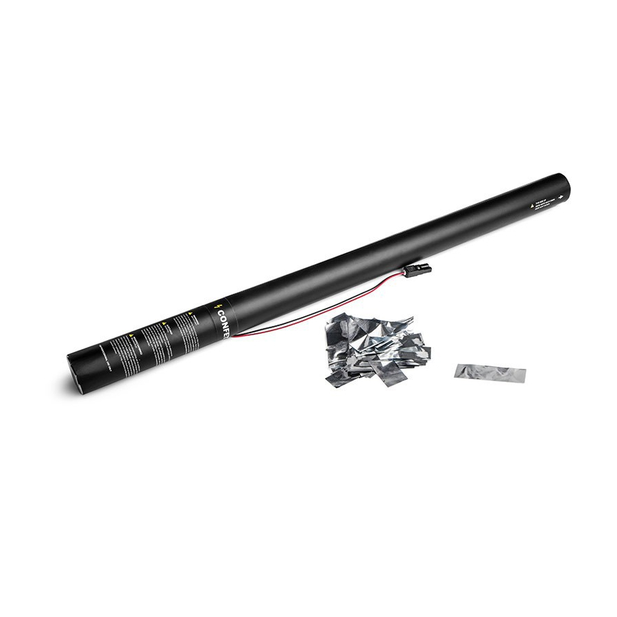 80 cm electric cartridges filled with silver-coloured, fireproof rectangular confetti. All our cartridges are filled to maximum capacity with confetti and streamers.