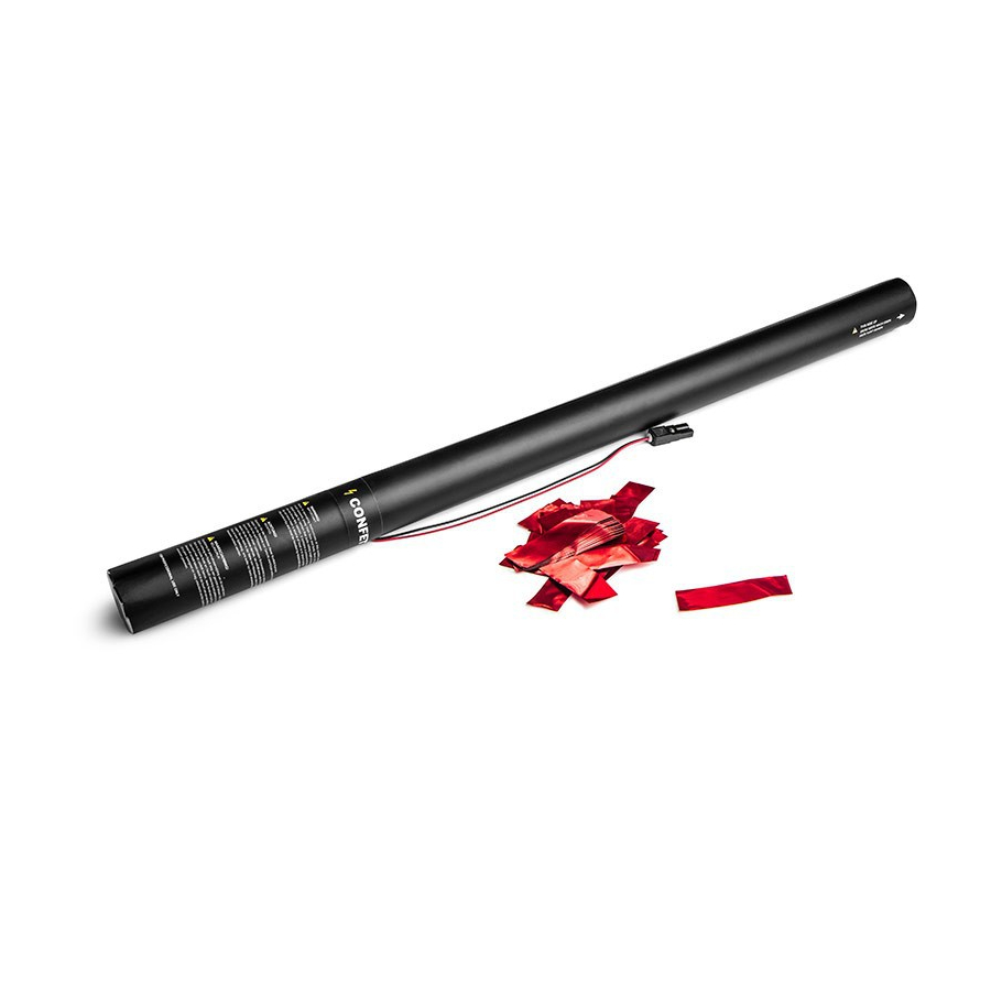 80 cm electric cartridges filled with fireproof rectangular confetti in metallic red. All our cartridges are filled to maximum capacity with confetti and streamers.