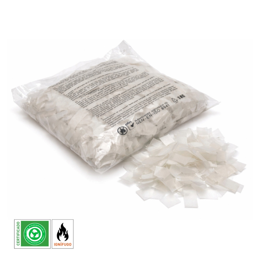 It is a high-quality water-soluble paper confetti with a 70% dissolution rate. It is not fireproof, so it should not be used with equipment that produces flames or sparks. Designed for professional indoor and outdoor use, it adds colour, dynamism and safety and is biodegradable.
