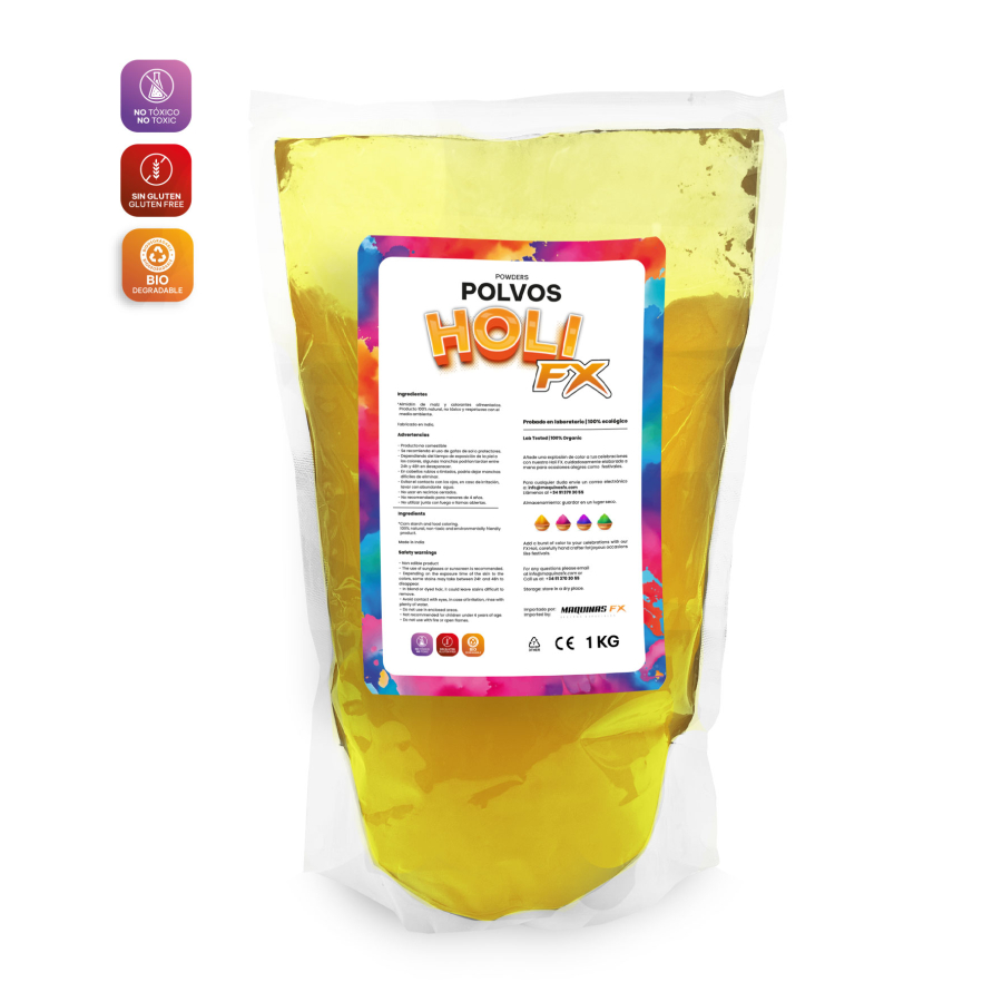 HOLI FX Yellow Powder Bag 1Kg: intense and vibrant colour for parties, festivals and celebrations. Safe, non-toxic and certified product, ideal for large outdoor events.