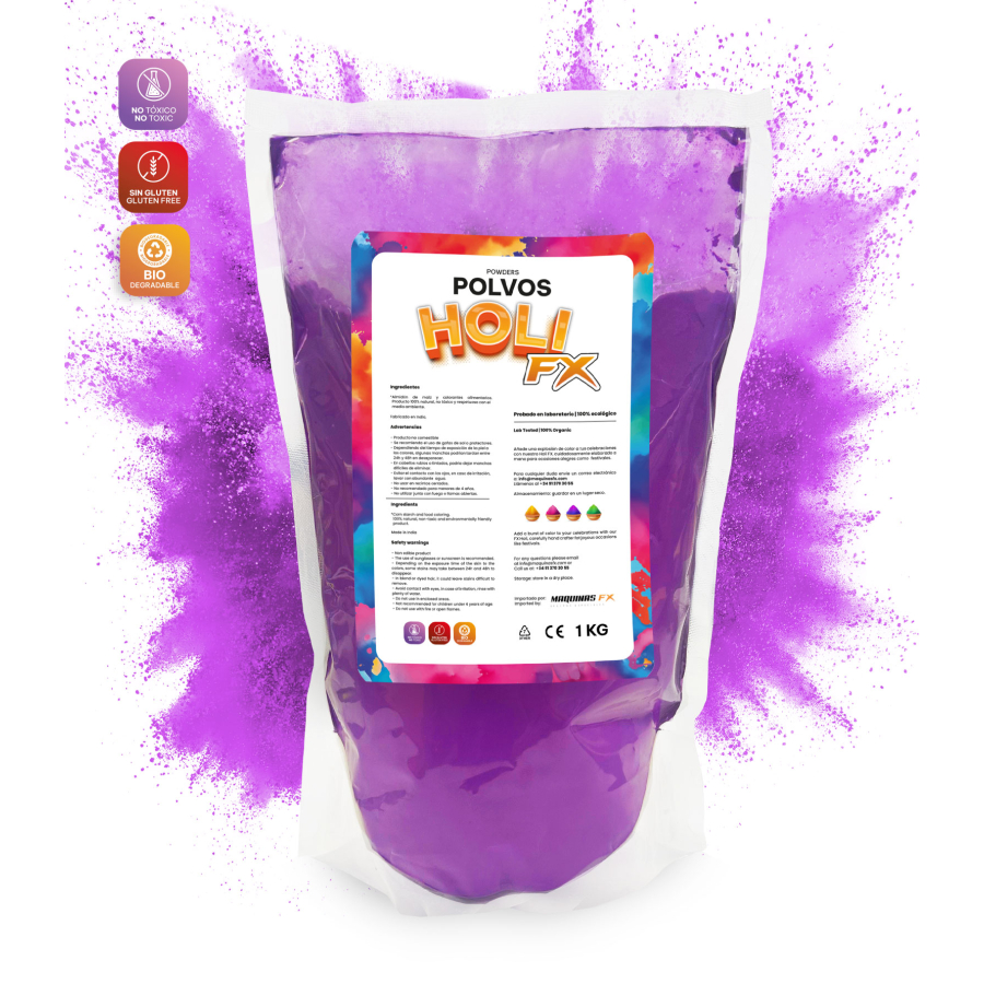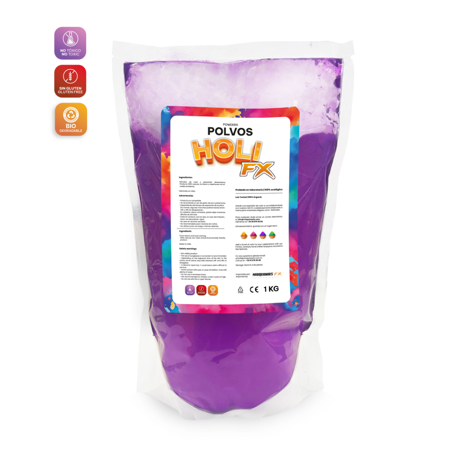 Turn your event into a unique experience with the 1 kg bag of HOLI FX Purple Powder. Buy online and receive it anywhere in Spain with a full guarantee of quality and safety.