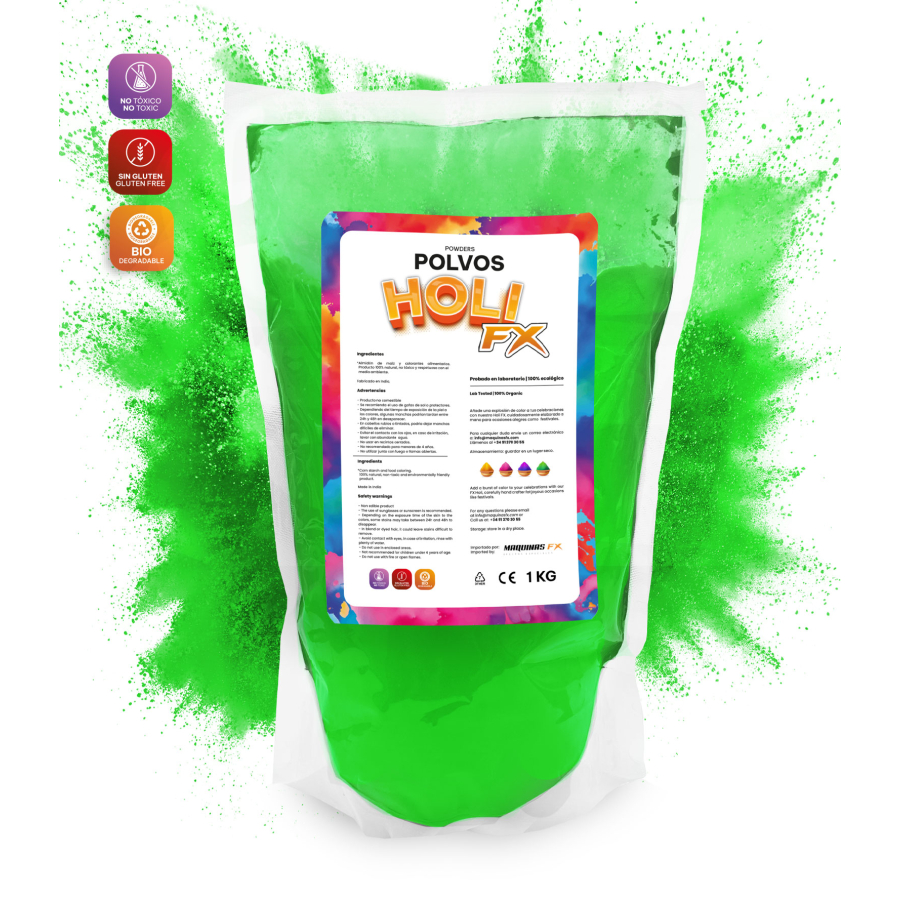 Bring freshness and energy to your celebration with the 1kg bag of HOLI FX Green Powder. Buy online and receive it anywhere in Spain with a full guarantee of quality and safety.