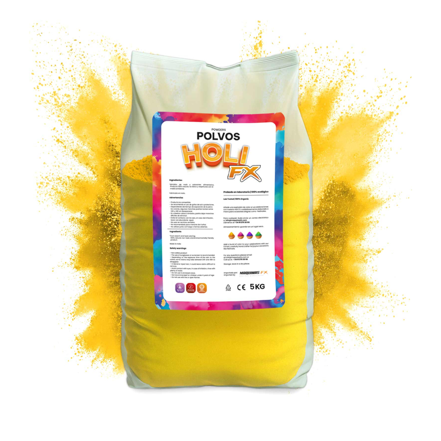 Fill your event with joy and colour with the 5kg bag of HOLI FX Yellow Powder. Buy online and receive it anywhere in Spain with a full guarantee of quality and safety.