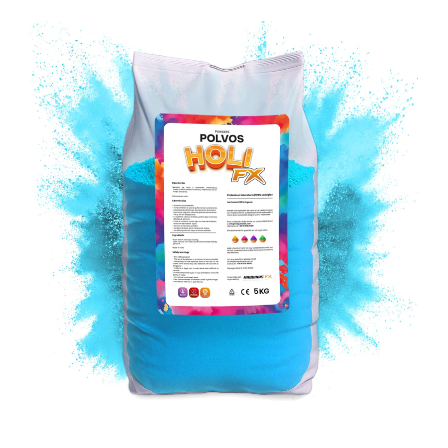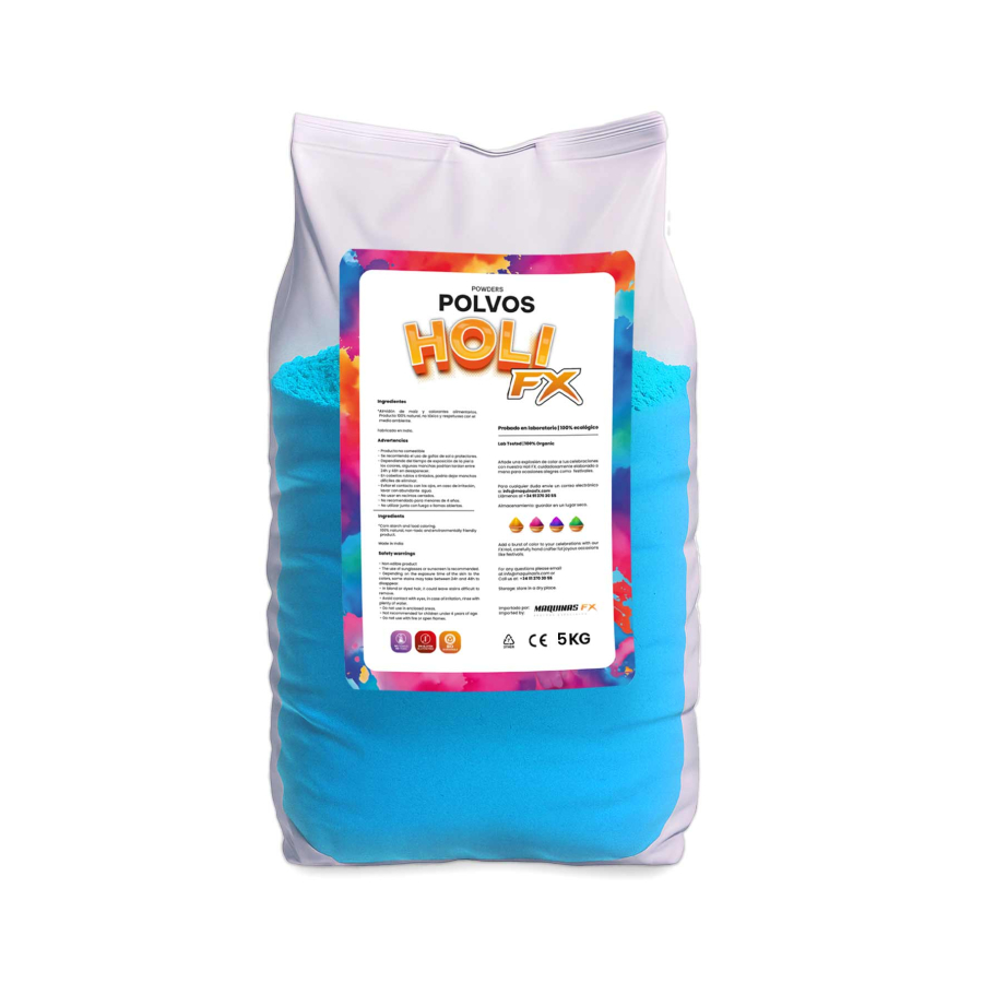 Fill your event with joy and colour with the 5kg bag of HOLI FX Blue Powder. Buy online and receive it anywhere in Spain with a full guarantee of quality and safety.