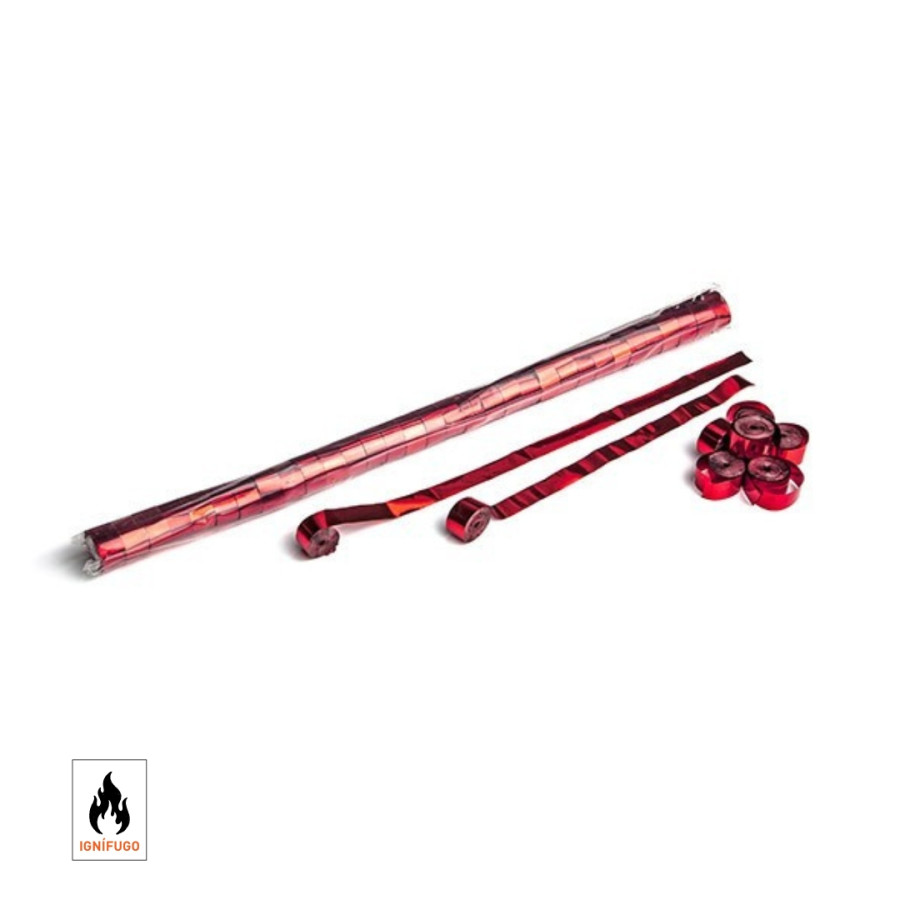 Metallic serpentine made of red fireproof material, according to current regulations. Solid colors and in packages of 100 units. Dimensions: 5 x 0.85 m.