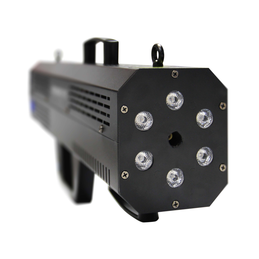 The SMOKE GUN is an electric smoke gun designed to create a powerful and dynamic effect in live performances. Its integrated multicolour LED system illuminates the smoke column for a much more visually striking result.