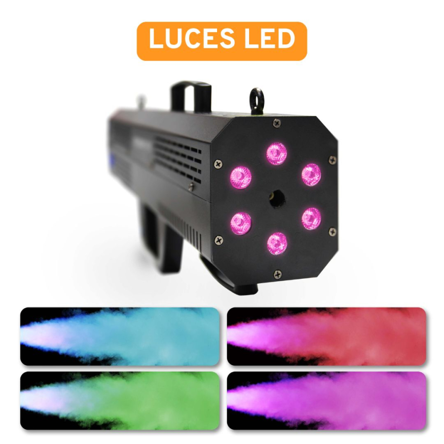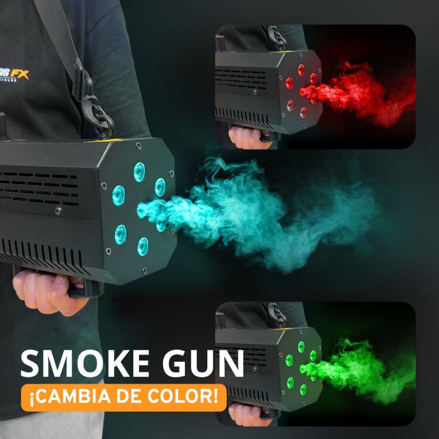 Thanks to its integrated multicolour LEDs, the SMOKE GUN generates a dynamic effect that illuminates the smoke and enhances the show. It works with normal Maquinas FX smoke fluid without the need for CO₂.
