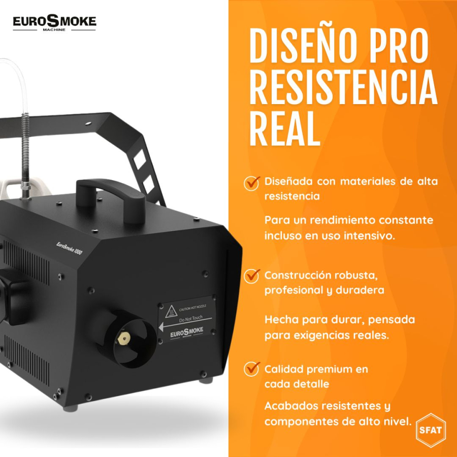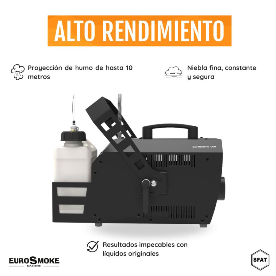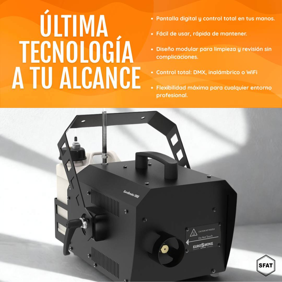 The SFAT EUROSMOKE 1000 from Máquinas FX is part of a new range of professional machines designed to produce a fine, constant fog that enhances any lighting effect. Its technology allows for versatile and reliable performance, ideal for multiple applications and professional environments.
