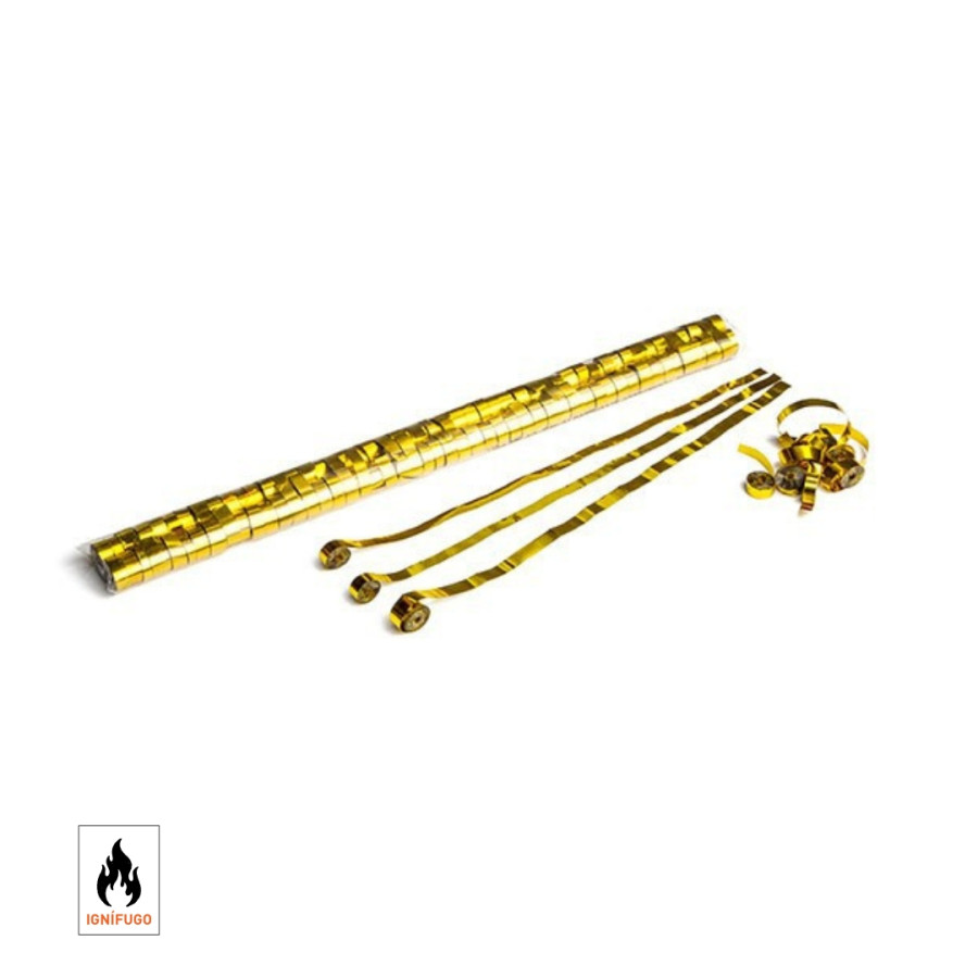 Metallic gold fireproof streamers, in accordance with current regulations. Solid colours and in packs of 100 units. Dimensions: 5 x 0.85 m.